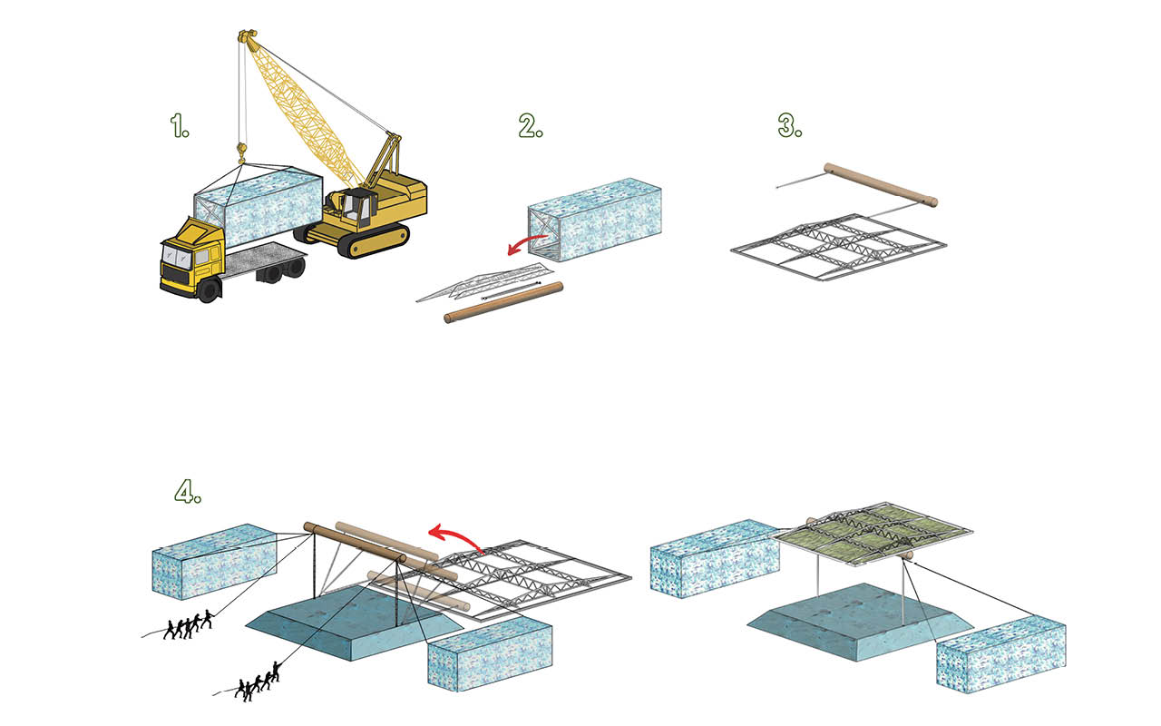 ポップアップステージ(西)では、最小の手数で、空間をいかにして作るかを考えました。それも、人間の力で作れるくらいのシンプルなもので十分ではないかと。モノを作ることでモノを否定し場と人の重要さを訴える、というのもなんだか倒錯しているようではありますが、ここで何か作らないとオブジェみたいな建物だらけになるのではないかと思ったからです。